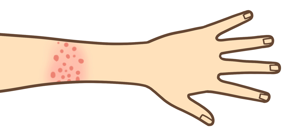 神経に沿って出現するため、からだの片側に帯状に出てくる紅斑と小さな水疱が特徴です。途中の神経も炎症を起こし刺激を受けて痛みを伴います。