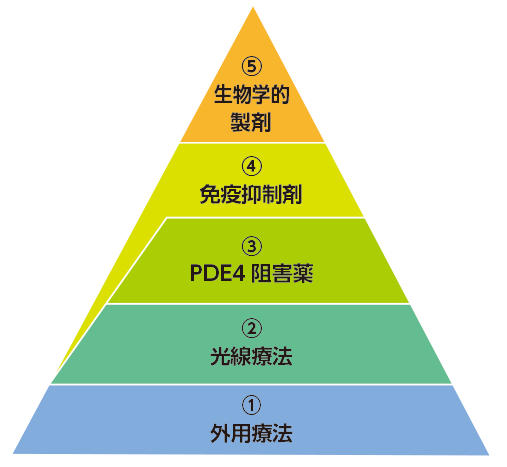 乾癬の治療方法は重症度に応じて異なります。重症度に応じた乾癬治療の基本的な考え方は、図のピラミッドのように、重症度が上がるにつれ、ピラミッドの上の段の治療に変えるという「乾癬治療のピラミッド計画」と呼ばれています。